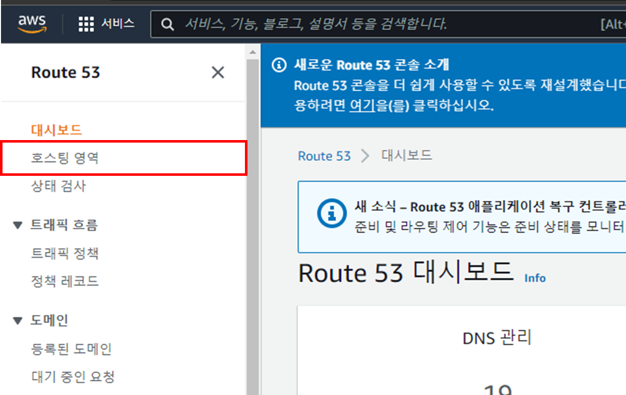 호스팅영역을 클릭해주세요