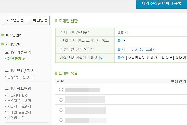 현재 cafe24에 등록한 도메인 목록이 나옵니다