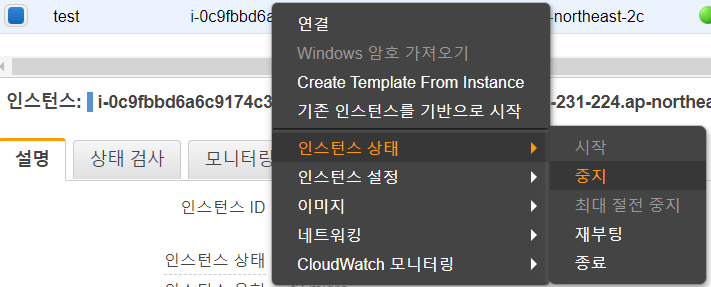 종료 방식 - 아래와 같이 인스턴스의 상태 중 중지, 종료가 있는데 중지를 눌렀을 때도 종료를 시킬것인지, 종료를 시켰을 때 인스턴스 종료 시킬 것인지 종료를 선택할 수 있다.