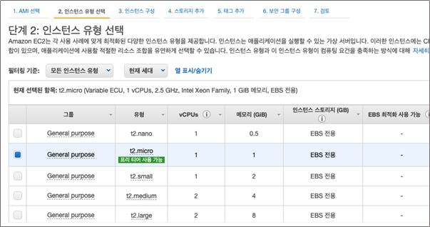 AMI를 선택하면, 인스턴스 유형 선택이라는 화면이 나오는데 이는 서버의 크기를 선택하는 것이다. 자신의 개발 범위에 맞게 선택을 하면 된다.