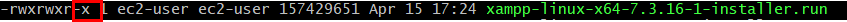 쓰기권한을 줘야하는데, sudo chmod +x xampp-linux-x-64-7.3.16-1.16-1-installer.run을 입력하면 아래와 같이 뒤에 쓰기 권한이 추가된 것을 볼 수 있다.
