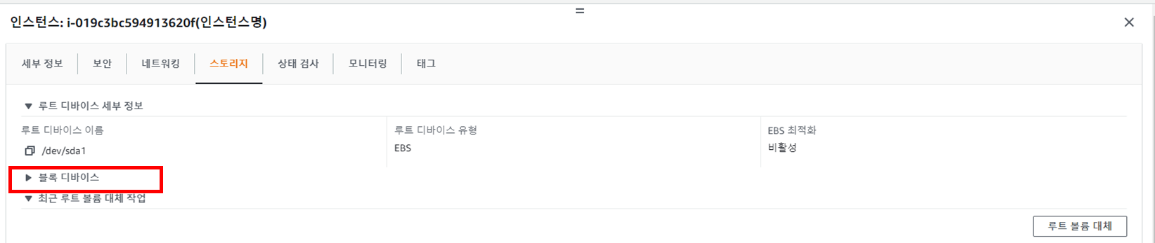 블록 디바이스를 클릭하면 볼륨 ID, 디바이스 이름, 볼륨크기, 연결상태,연결시간, 암호화질 등